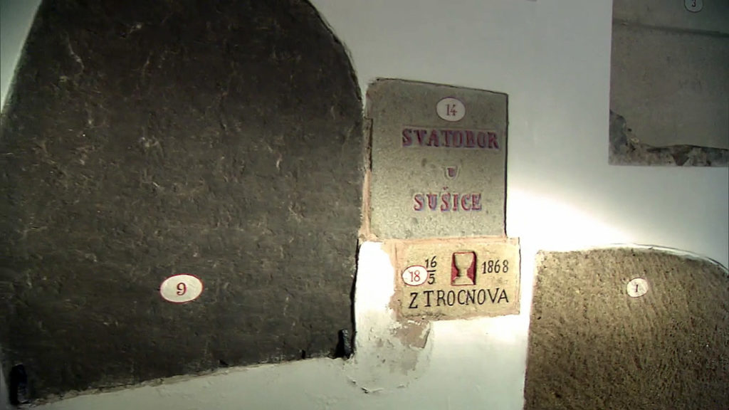 Nastal čas podívat se úplně dolů, k základním kamenům ND. Ano, ten plurál je tam správně, věděli jste, že základní kámen není jeden, ale devatenáct? Architekt ND si totiž naivně myslel, že bude stačit přivézt kámen z posvátné hory Říp, a je to. Jenže Říp byla sopka, a ta hornina není úplně reprezentativním vzorkem, a navíc se ozvalo Brno, že pokud z Řípu se bere kámen, oni chtějí taky jeden poslat, protože už tenkrát si mysleli, že jsou důležití. No, a když dalších sedmnáct českých měst vidělo, že BRNU to prošlo, tak napsali do Prahy: „Tak pokud jste to schválili Brnu, tak my chceme taky dodat základní kameny pro stavbu divadla. No, a proto jich je tolik – všechny jsou označené jménem původu a číslem. Vedle kamenů se nachází i velká interaktivní tabule, na které můžete milé kameny posouvat, nebo nádherná malá dřevěná replika Divadla.