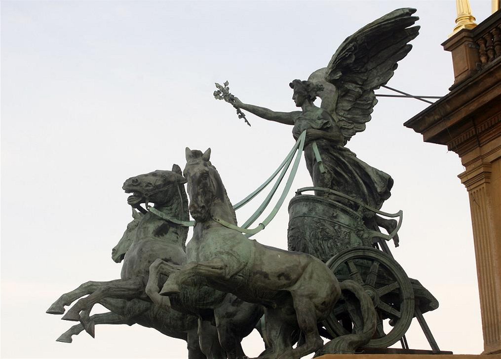 Po prohlídce galerie, impozantní opony, výzdoby a maleb jsme šli ještě více nahoru – konkrétně na střechu. Zde dominovaly sochy Bohuslava Schnircha a obzvláště působivé byly takzvané trigy – lehký dvoukolový vozík z období antiky, tažený třemi koňmi. Já teda nevím, jak Vy, ale já byl na střeše ND poprvé. Bylo krásně, a zatímco ostatní zběsile mačkali spouště svých mobilů, já a Terka jsme se kochali příjemnou polední pražskou scenérií.