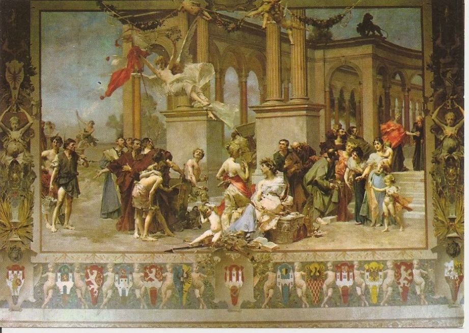 Následoval sestup dolů. V úvodní místnosti jsme dostali další nalejvárnu ohledně zdejších fresek, které povětšinou vyobrazovaly významné události našich dějin, a tři z nich dokonce představovaly cyklus: Nejdřív dobu Karla čtvrtého, kdy tady bylo všechno čupr gut, Čechie hoduje s múzami, a malý Národ vzkvétá, jenže pak na druhé fresce přichází doba pobělohorská, Čechie i Národ se válí na zemi v poutech a múzy zbaběle berou roha. Na třetí fresce ale vše dobře dopadne, bo je doba národního obrození, Čechie a Národ shodí svá pouta, svítí sluníčko a proradné múzy se opět plazí ke křížku a chtějí si s nimi hrát.