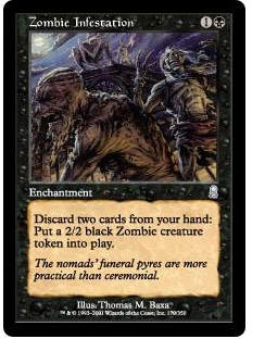 Beru gobliny, minule jsem si je ani nezahrál, a ačkoliv nečekám, že s nimi zvítězím, málokdy se stane, že by goblini aspoň neudělali pořádný brajgl. Pavel si sestavil super levný balíček, jehož nejdražší položkou byly pravděpodobně obaly. Není to ale vůbec špatné – založil to na neomezeném počtu karet v ruce, které si přes jednu kartu nalíže, aby je potom zahodil do enchantmentu Zombie Infestation a zlotřile zahájil zkázonosnou Zombie Apocalypsu.