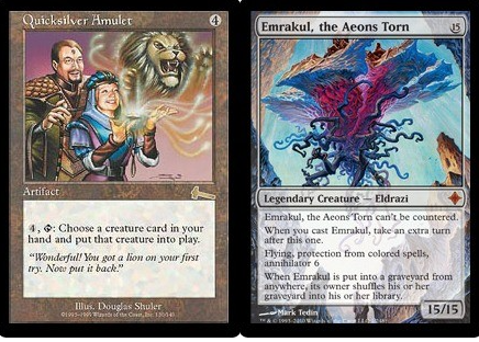 Takto získávám Kamilova legendárního výběrčího, několik Pijerových shadowů, a Anyho příšery s lifelinkem. Ze seznamu „100 věcí, které chci stihnout před smrtí“ si mohu po neděli odfajfkovat položku „prudit Kamila s jeho vlastním výběrčím“ protože poslušně hlásím – splněno! Porážím Kamila i Anyho, a zůstává Pijer, který se srdnatě brání pomocí Darkness a Holyday. Vzpomínáte na Emrakula? On má takovou schopnost, že když jde do hřbitova, mícháte hřbitov do knihovny. Tedy si ho znovu najdu, vyložím, a zdecimuji nejprve Pijerovy landy, nakonec i samotného Pijera. Démoni opět vyhrávají a prodlužují svoji vítěznou šňůru. Sice je to pomalý, ale když se to dostane ke slovu, jednoznačně můj nejlepší multiplayerový balík.